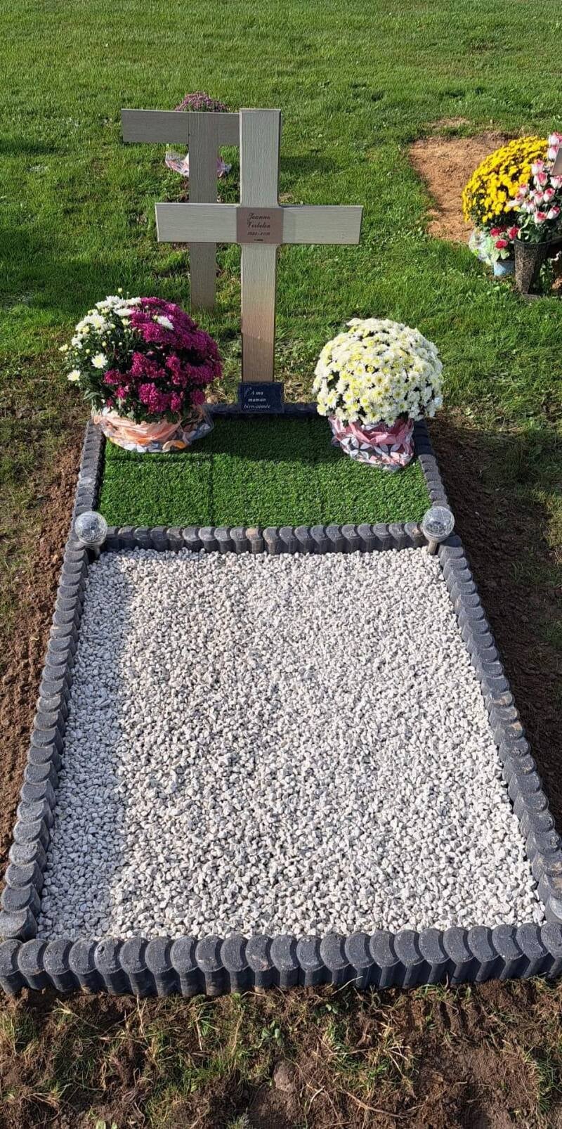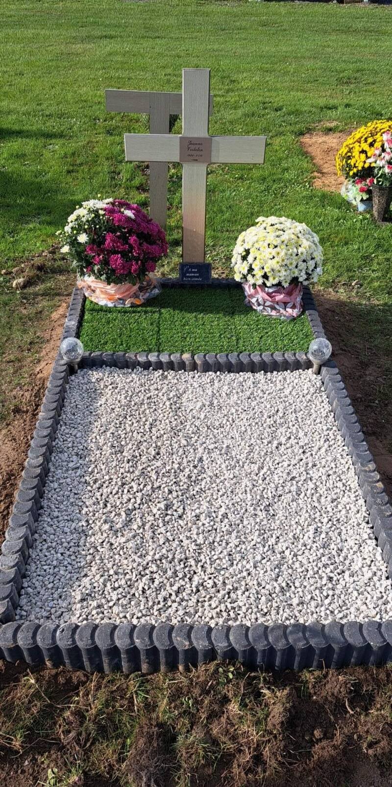 - Aménagement de tombe pleine terre , bordures ,cailloux , ... (voir photos ci-dessous)